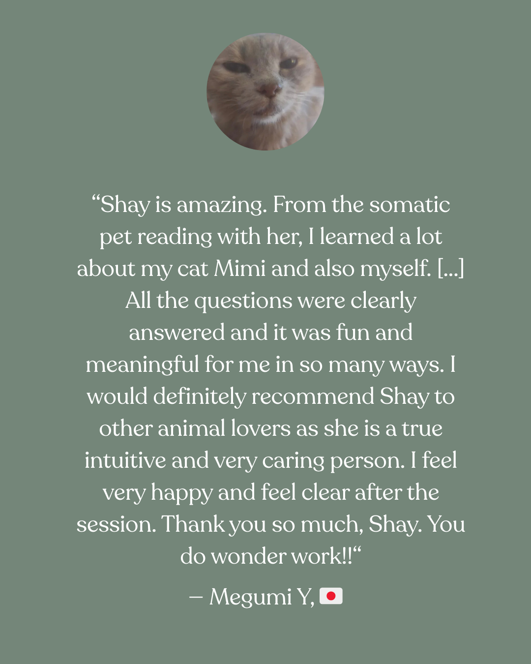 Shay spoke to my kitty with such RANGE! She connected so clearly to the practical needs of my cat that I felt I could put into action right away, and also communicated such beautiful messages from my cat's soul to mine that I'll be leaning into for our lifetime together.